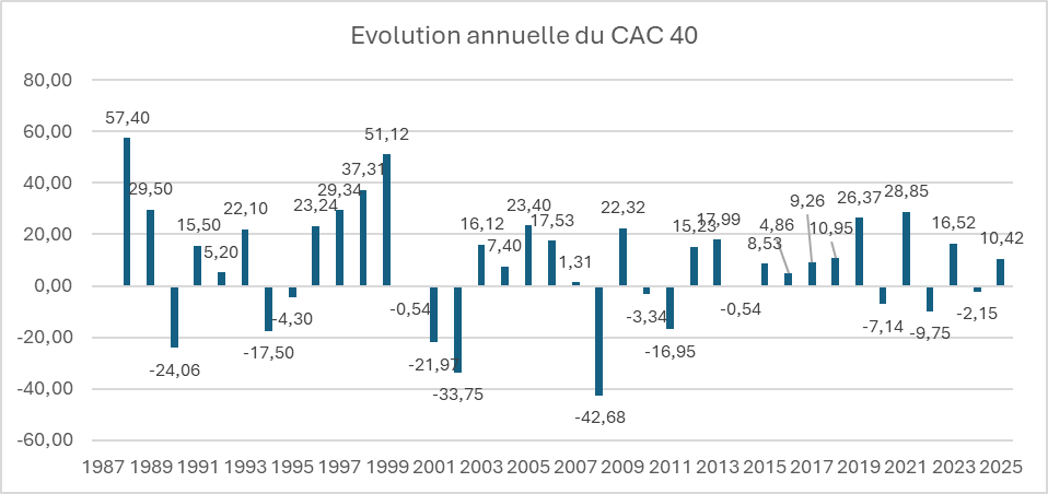 Après avoir perdu 2,14 % en 2024, le CAC 40 s’est apprécié, en 2025, de 10,42 %. Ce résultat positif est intervenu malgré un contexte politique toujours des plus complexes et la politique douanière américaine. Même si, au mois d’octobre dernier, le CAC 40 a battu son record, qui datait du 10 mai 2024, avant la dissolution, il reste largement à la traîne des autres grands indices boursiers. Le poids du secteur du luxe, exposé aux guerres commerciales, et la situation financière de la France expliquent le retard pris par le CAC 40 par rapport aux autres grands indices européens.