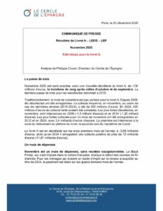 Accueil > Communiqués de presse > 2025 > Analyse des résultats du livret A au mois de novembre 2025 par Philippe Crevel : Sale temps pour l’épargne réglementée > Communiqué de presse de Philippe Crevel – directeur du Cercle de l’Epargne – résultats du livret A – novembre 2025