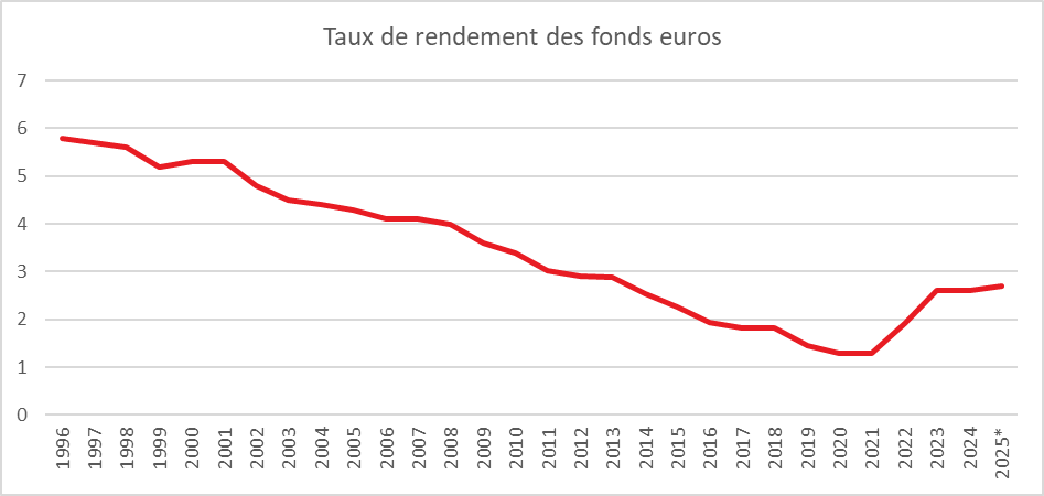 Ce changement est lié à une amélioration de leur rendement, en valeur absolue comme en valeur relative. En 2025, le rendement moyen des fonds en euros, au vu des premières communications des compagnies d’assurance, devrait se situer autour de 2,7 %. Il est ainsi supérieur de 1,5 point au point bas atteint en 2020 et 2021, lorsque les taux des obligations d’État évoluaient en territoire négatif. Plusieurs assureurs ont publié des rendements supérieurs à 3 %. Par ailleurs, de nombreux assureurs proposent des taux « boostés » pouvant majorer le rendement des fonds de 1,5 point, des taux de 5 % ont ainsi été accessibles.
