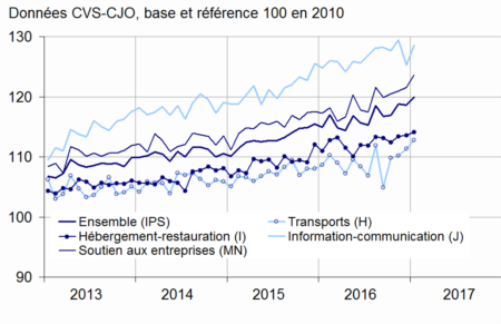 Selon l’INSEE, au mois de janvier, la production des services a progressé de 1,1 % contre une baisse de 0,2 % en décembre. Sur les trois derniers mois, la hausse atteint 1,5 % par rapport aux trois mois précédents. Elle augmente fortement dans les activités immobilières (+4,3 %). Elle croît aussi dans les activités de soutien aux entreprises (+1,2 %), en particulier dans les activités de services administratifs et de soutien (+1,9 %). En revanche, elle se contracte légèrement dans l’information et la communication (−0,2 %).