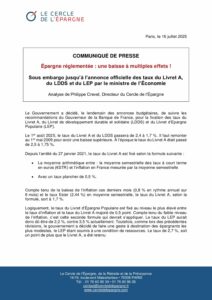 Accueil > Communiqués de presse > 2025 > Épargne réglementée : une baisse à multiples effets ! > CP Cercle de l’Epargne – Philippe Crevel – Rémunération du Livret A et du LEP au 1er août –