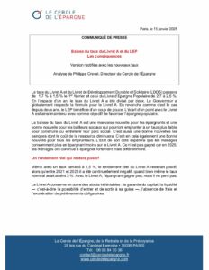Accueil > Communiqués de presse > 2026 > La baisse du taux du Livret A et du LEP : quelles conséquences ? > Communiqué de presse de Philippe Crevel – directeur du Cercle de l’Epargne – Conséquences de la baisse du taux du Livret A et du LEP 15 janvier 2025