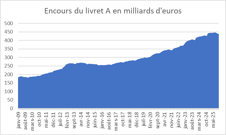 L’encours du livret A est passé, de décembre 2019 à juin 2025 (niveau record), de 298,6 à 445,5 milliards d’euros, soit un gain de 146,9 milliards d’euros.