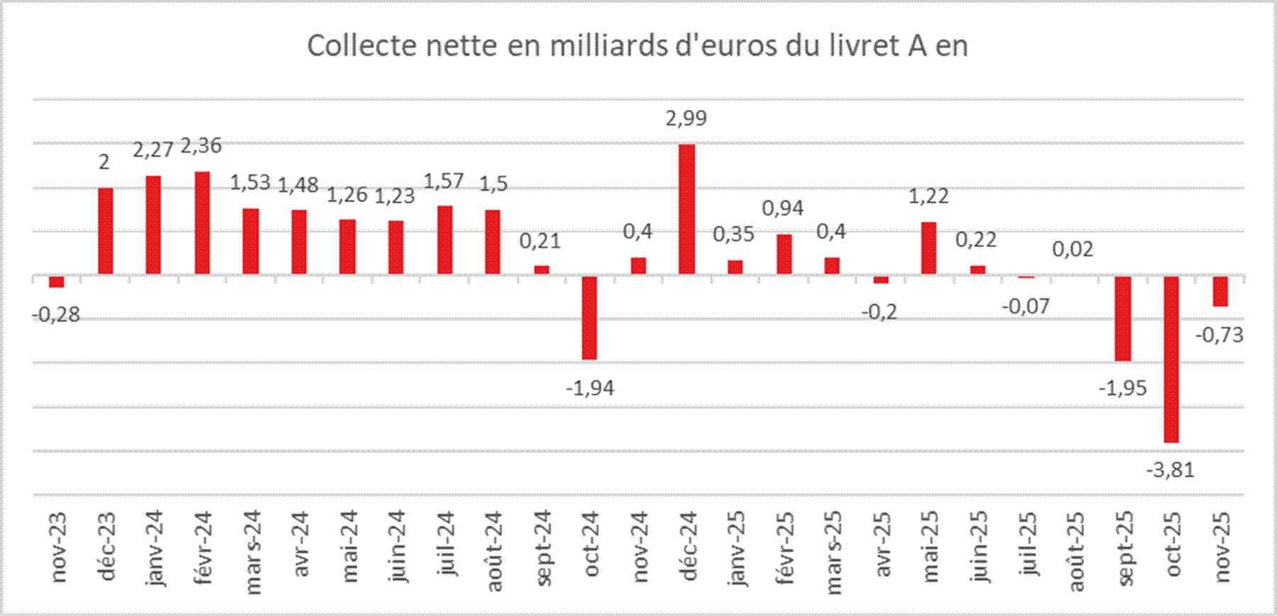 Sur les onze premiers mois, le LEP est en décollecte de 1,5 milliard d’euros, alors qu’il était en collecte positive de 6,26 milliards d’euros sur la même période en 2024.