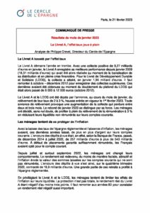 Accueil > Communiqués de presse > 2023 > Le Livret A, l’effet taux joue à plein > CP Cercle de l’Epargne – Philippe Crevel résultats Livret A résultat janvier 2023