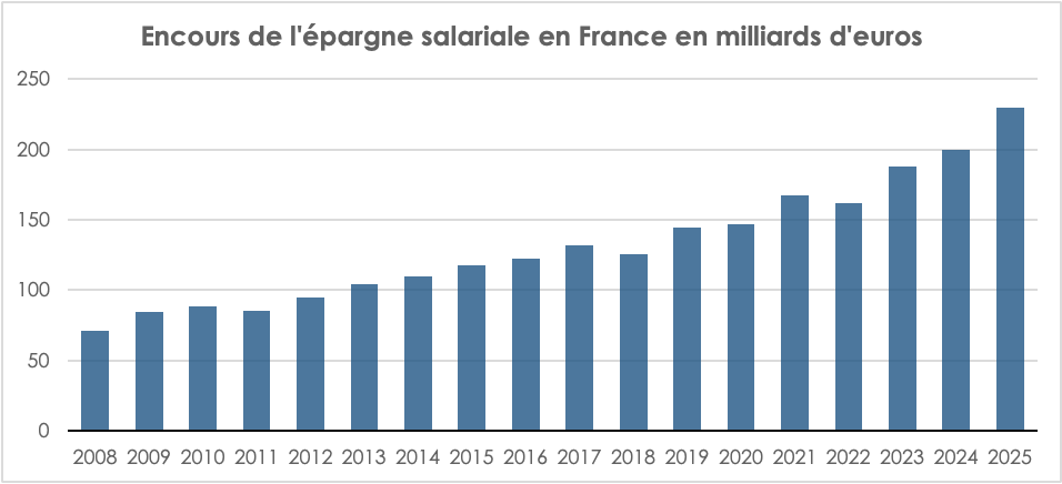 En 2025, les encours de l’épargne salariale atteignent, selon l’Association Française de Gestion, 229,4 milliards d’euros, en progression de 14,7 % sur un an. Depuis la crise financière de 2008, cette épargne a connu une croissance moyenne annuelle de 7,1 %, rythme supérieur à celui de nombreux placements traditionnels. En 2025, 442 000 entreprises proposent un PEE et/ou un PER, soit + 26 000 sur un an. 403 000 entreprises offrent un plan d’épargne entreprise (soit + 24 700 sur un an) et 262 000 un plan d’épargne retraite collectif (soit + 21 800 sur un an).