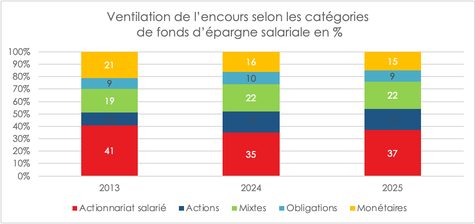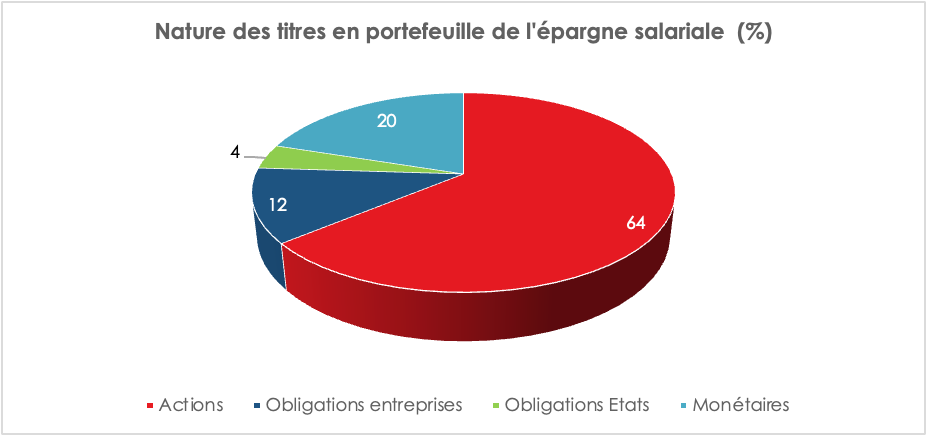 83 % des encours sont investis en zone euro et 57 % en France. La proportion atteint 66 % pour les actions cotées en France. L’épargne salariale contribue ainsi, de manière diffuse mais réelle, à la souveraineté économique nationale.