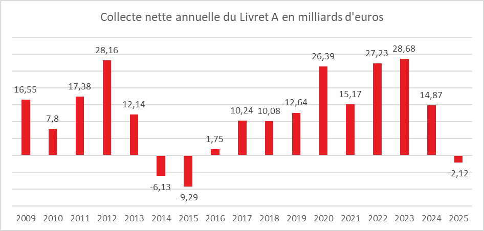 Depuis 2009, année du début des statistiques de la Caisse des dépôts, le Livret A n’a connu que trois décollectes annuelles, en 2014 (–6,13 milliards d’euros), en 2015 (-9,69)et donc en 2025 (-2,12). Le résultat de 2025 marque une réelle rupture, car il intervient après plusieurs années très favorables : +28,68 milliards d’euros en 2023 (record absolu depuis 2009) et +14,87 milliards d’euros en 2024.