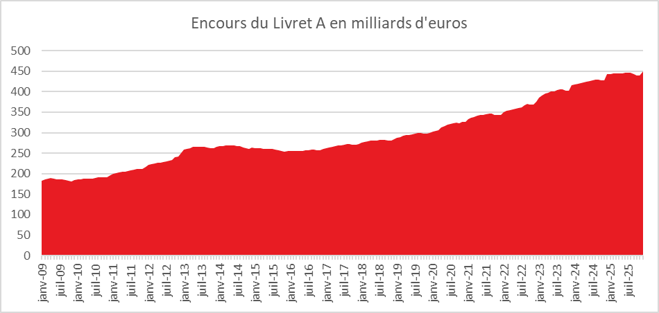 Malgré la décollecte, mais grâce aux intérêts capitalisés, l’encours du Livret A se rapproche de 450 milliards d’euros (449,6 milliards d’euros), ce qui constitue un nouveau record.