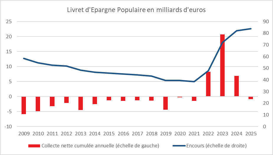 Après trois années consécutives, entre 2022 et 2024, de collecte positive, le Livret d’Épargne Populaire renoue avec la décollecte en 2025, à –840 millions d’euros. Entre 2022 et 2024, le LEP avait bénéficié d’un taux élevé atteignant jusqu’à 6,1 %. Il avait également bénéficié du relèvement de son plafond de 7 700 à 10 000 euros en 2023. Les campagnes des pouvoirs publics et des banques visant à inciter les personnes éligibles à en ouvrir un avaient conduit, entre 2021 et 2024, à une augmentation de trois millions du nombre de LEP. La collecte avait été positive de 6,88 milliards d’euros en 2024, de 20,67 milliards d’euros en 2023 et de 8,28 milliards d’euros en 2022.