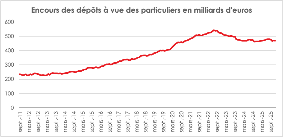 La rupture la plus spectaculaire intervient néanmoins entre 2019 et 2022. En 3 ans, l’encours passe de 406,4 à 522,9 milliards d’euros, soit +28,7 %. Corrigée de l’inflation cumulée de la période, la hausse reste de +19,8 %. Cette poussée est cohérente avec le choc pandémique et ses suites. L’épargne forcée, la baisse des dépenses de consommation pendant les confinements et le maintien des revenus ont alimenté une accumulation de trésorerie sans précédent. Avec le retour de l’inflation entre 2022 et 2024, les dépôts à vue régressent légèrement avant de se stabiliser puis de légèrement augmenter en 2025.